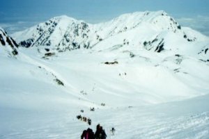 翌日は快晴となり、代表的な一ノ越からタンボ平ツアーコースへ。一ノ越は登山者とスキーヤーで大賑わい。まず広々した御山谷上部を滑った。スキーヤーはほとんどこの谷を黒部湖へ下って行く。登り返して東一ノ越へ急斜面を慎重にトラバース。スキーを脱いで20分程歩く必要あり。東一ノ越からは、下に見える駅を目指して、好きなコースで広いカールを大滑降。