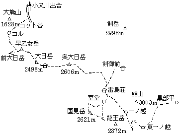 (12:30/12:48)…早乙女岳(13:14/13:35)…コット谷出合(14:30)…小又川出合(15:40)