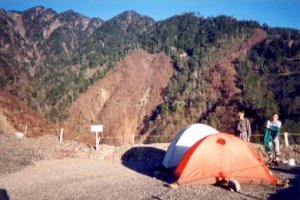 あとは往路を戻るのみだから安心、と気を抜くのは禁物。例の崩れているところからルートをはずして右に入るとなかなか正しい道に戻れず、気がつくと先の稜線が左側に見えて、右の間違った尾根に入っていることがわかった。少々焦って強引にトラバースして窪地状のルートに戻った。以降はテープからはずれないよう慎重に行く。大倒木帯の先の下りでは左の尾根に入らないよう要注意。16時に無事テント地にたどり着く。2人組も私の近くに幕営した。