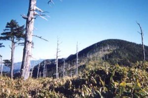 中ノ尾根山への平らな稜線は、笹の草原と立ち枯れとコメツガの森のかもし出す雰囲気が黒法師の付近にそっくりで、またあの深南部に来たんだと実感。中ノ尾根山頂は樹木に覆われ展望無く、これも黒法師と同じ。山頂から鞍部への下りは、鹿道が交錯してわかりにくく、いよいよ深南部本来の踏跡になる。こういう所はテープ目印が頼りになる。次のヨモギ沢の頭へは岩場の右手を巻き気味に登っていく。目指す池口岳の南峰は平らで樹木に覆われ、北峰はガレて迫力があって対照的だ。