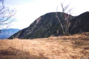 三又山は草原状で気分良い。眺めも木曽駒から北ア方面まで広がる。この先しばらくは、比較的平坦な原生林の道。行ってみたい大無間〜朝日岳の稜線も見える。鶏冠山の手前には岩峰が行手を阻んでいて、右手を少し巻いて再び尾根に這い上がり、尾根上の心もとない踏跡をたどる。アルペンガイドは長野県側を巻くと記しているが、そんなルートは無さそうだった。南峰の下りも急な難所。前半は岩稜の右側のザレ斜面をジグザグに下降、鶏冠岩の鞍部を右に入り、後半は急な稜線を樹木を頼りに下っていく。