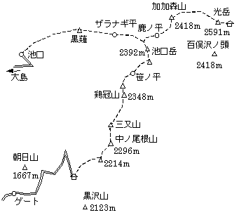 鹿ノ平(6:48)…池口分岐(7:27/7:36)…ザラナギ平(8:38/8:50)…黒薙(9:41/9:50)…遠山氏宅