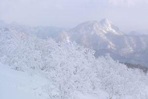 頂上では風が昨日ほど強くないのでのんびり休めた。眼前には山頂に岩場がある目国内岳が聳え、登行欲をそそらられる。春には日帰りで十分登れるそうだが、今の時期はラッセルや日照時間を考えるとちょっと厳しい。岩内岳の右に日本海、新見峠を隔てて白樺山からシャクナゲ岳あたりのピーク群を眺める。山頂から本日もまたバージンスノーを堪能することができ最高である。林道ヘアピンの所まで、程良い傾斜で下り一方なので、とても滑りやすくスキー向きの山と言える。なのに人の姿は皆無であった(元旦くらいは皆、家に居るのかもしれない)。下山途中からまた雪が降りはじめた。下山後、静かな秘湯の新見温泉で入浴。浴槽は独占状態、露天風呂の他、蒸湯や滝湯もあって面白かった。