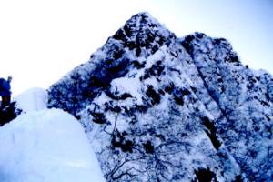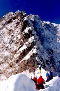 登り切ると目の前に五段の左下がりのバンドを持つ岩場があり、核心部の下に出た。朝の新雪が溶けて岩が露出している。取り付いているパーティーは、昨日尾根の途中でビバークしたようだ。私はアイゼンでの岩登りは未経験だが、取り付いている人は何とか登っていて、我々も順番を待って岩稜通しに挑戦することにした。人数の多い2パーティーは、岩場を避けて左の潅木の生えた急斜面をザイルFixして雪を落としながら登っていった。