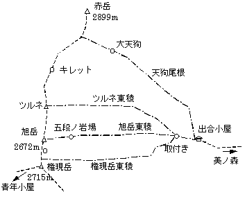 三連休にO君が行きたいという旭岳東稜に同行させてもらうことにした。キレットから権現岳へ登る途中にある旭岳は、縦走路はわずか山頂を巻いてしまうため印象が薄い山である。しかしここの東稜は、地獄谷側からの最も代表的な雪稜ルートということだ。一昨年のNiftyには美ノ森から日帰りで行った記録があり、また秋にガイド山行で隣の天狗尾根を下った時の感じから、割りと軽く考えていた。鈍行で先行したO君と小淵沢で合流。近年は雪が少ない傾向だが、もっと古そうな過去の記録コピーを見せてもらうと、ラッセルや微妙なバランスの岩登り、雪崩要注意の斜面など難しそうなことが書いてある。これは自分の実力以上の所に来たかと多少心配になる。