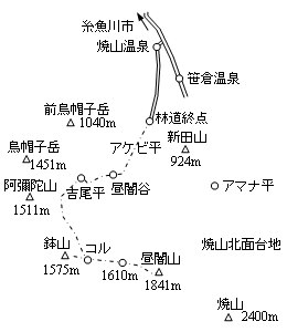 自宅(4:40)=焼山温泉=林道終点(11:22/11:52)…昼闇谷(13:45/14:00)…吉尾平(14:50//5:00)