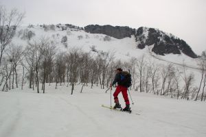 雪が緩んでくるので下り急斜面はより慎重にピッケルを刺して一歩一歩下る。スキーデポ地からは、表面が柔らかくなった適度な斜面を快調に滑りあっという間にコルへ。再びツボ足で鉢山アタックを試みる。雪の割れ間となった垂直な壁を突破するも、その先は雪が落ちてブッシュがひどく途中で断念して引き返す。雪が緩んだ下りは足場が崩れやすく思ったより危険、山頂を狙うなら雪の締まった早朝の方が良いかも。