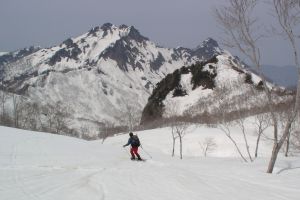 99年に海谷山塊の山スキーに出かけた際(報告済)、登れなかった昼闇山(+鉢山)に再挑戦することにした。日帰りで登った報告もあるが、余裕を持って山中一泊で出かけた。前回の時より積雪はだいぶ少なく、最初の渡渉点手前の林道終点まで車で入れた。歩いてきたショートスキー3人組が先に向かう所だった。渡渉は泥沼地獄かつ水量多く厳しそうで、工事の為なのか足場の悪いブリッジがあってそこを渡り、対岸の急斜面でも踏み抜きに苦しむ。初っ端から難所であったが、その後はスキーを履いてアケビ平のトレースに従って順調に登る。途中単独のスキーヤに会い、日帰りで鉢山を目指すも雪が悪いので登頂は断念したとのこと。