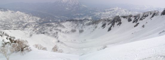 ピークにスキーをデポしてピッケルを持って先へ進む。窪地付近に昨日の3人組が泊ったらしい雪洞があった。彼らは昼闇谷左岸の尾根を登ってきたようだ。この先稜線の右をトラバース気味に進み、上部は急斜面や雪庇に注意して稜線上を慎重に進む。トレースから見て3人のうち1人はショートスキーを履いたまま登ったようで驚き。昼闇谷カールの全体が見渡せ、雪庇の無い所から滑り込めば一気に出合まで行けそう。ホームページにはここを滑降した報告もあるが、今回は無理しないことに決めていた。実際誰かが滑ったような形跡は無かった。