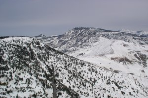 林道沿いに1つピークを巻くと万座峠。北側の谷は地獄覗きといった様相。滑らない林道も最後の辛抱で、ゲレンデコースに合流して心に残る縦走の終了となった。ゲレンデをひと滑りして温泉に入ってからバスで駅へ戻る。車窓から縦走した連山を見ながら、それぞれのピークを思い出した。特に破風岳は急峻で、この角度からはとてもスキーで超えられないように見える。