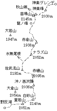 長野原草津口(9:59)=野反湖(10:45/11:05)…堂岩山(14:28/14:48)…鞍部テント場(15:25//5:45)