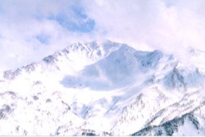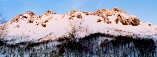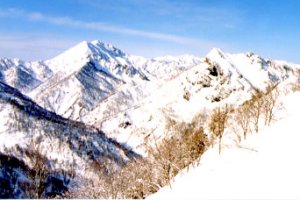 先行トレースは沢を詰めて進んでいく。前烏帽子岳を目指すために、右にトレースをはずれ、吉尾平下部の広い平坦地を幕営地に選んだ。深い雪の下でよくわからないが、尾根を巻いて登ってくる林道付近だったようだ。沢の本流は雪が切れて流れが出ている。荷物が重いこともあって、ここまでで結構くたびれた。一服してから、大きく窪んだ沢をブリッジの部分で横断し、前烏帽子岳を目指す。始めは林道の上のような感じ、次に沢を横切って樹林が適度に生えた小尾根へ取り付き、前烏帽子手前の鞍部めがけて登る。シール登高にほどよい斜面をたどり、小雪庇を崩して稜線に出る。少しやせた尾根をたどるとすぐに頂上に着いた。
