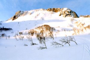体調は復活しないまま、空身で北面台地を目指す。天候は今日も良好。アマナ平から北面台地へ一段上がる斜面は、朝は雪が堅くてシールで登れず、スキーアイゼンを使用する。今日の体にはこたえた。台地の下部に登り着くと、正面の焼山へ向け遥かに無木立のなだらかな斜面が続き、疲れも吹っ飛ぶ光景。日本ばなれした山スキーの為にあるような斜面だ。昼闇山へは右に反れてトラバースして尾根に出ることになるが、体調悪いので断念し、素晴らしい北面台地を1800m付近まで登って、往路を滑降することにした。