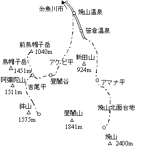 吉尾平テント場(5:33)…鉢山コル(7:35/8:38)…テント場(9:04/10:12)…焼山温泉(11:35/12:52)