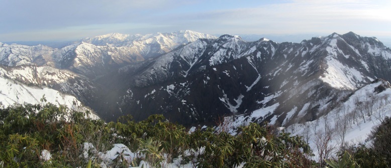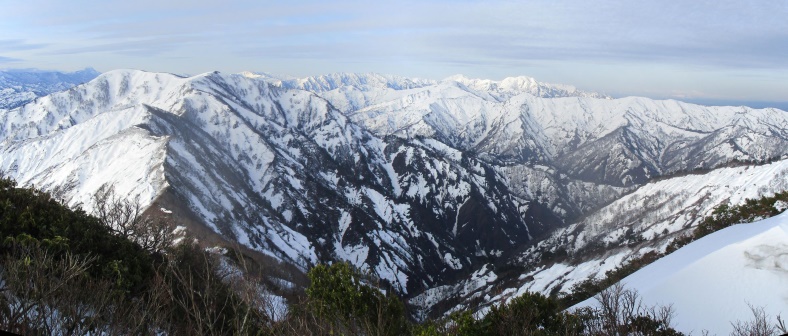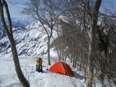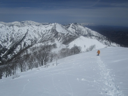 1日目の夜には降雪があり、翌日は20〜30cmのラッセルで時間がかかった。冬季の降雪が少なかった為か、尾根の雪庇が下にズレ落ちて藪こぎの箇所が多かった。そして大川猿倉山の少し先で垂壁に阻まれ、ザイルが無いと通過できないと判断し、ここで引き返すことにした。雪の量が多ければサイドを回り込んで通過できるものなのか不明。ただ、中2日は天気に恵まれ、以前縦走した未丈ヶ岳〜毛猛山や会津朝日〜丸山岳〜会津駒の稜線をはじめとした周辺の大展望が堪能できた。また見事なブナ林の中で日々表情を変える山の中のひと時を楽しむことが出来た。問題とされている、林道が崖っぷちを通過するブロック雪崩危険箇所は、トラバースでそのまま通過している人もいるようだが、我々は樹木を頼りに河原へ降りて危険箇所を避けて通過した。