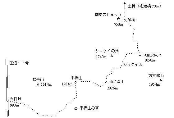 池袋(21:10)=火打峠(0:00//7:10)…稜線1750m(10:30)…平標山(10:47/11:05)…