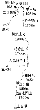(15:25//5:45)…巻機山(8:50/9:23)…清水(12:50/13:47)=六日町(14:17/14:42)=土合(15:30)