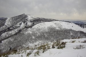 尾根上は雪も締まりラッセルは無い。昨日のトレース跡をジグザグに登山道の通りシールであえぎ登り、送電線まで来ると景色が一変。山頂一帯は緩斜面の草原、今は広〜い銀世界である。これが赤坂山の最大の魅力であろう。曇り空ながら天気はもってくれたので、頂上から三国乗鞍へ続く尾根や昨日登った伊吹山も見えた。三重嶽,三十三間山,雲谷山など不遇な江若国境の山々も眺められ興味深い。三重嶽の緩やかな尾根はスキーにも向いていそうだが...。三国山までピストンすると3時間はかかりそう、天候も下り坂だしここまでとする。寒風山経由のルートは様子がわからないので、登りと同じ確実なルートを滑ることにした。
