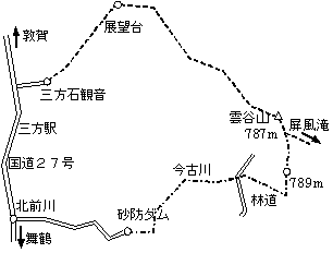 石観音への登山道を下る。ピークをいくつも越えて長い道のりに少々うんざりする。それもこの山の地形の複雑さゆえということか。途中から場違いなほど公園風に整備された中を歩くようになる。展望台からは三方五湖のすばらしい景観が得られた。今日も雨にはほとんど降られず天候はもってくれた。すべて順調とは言えないまでも、比良とあわせ中級クラスの沢を3本無事遡行完了できて満足である。