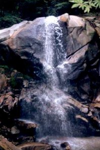 だが沢に入ると傾斜のゆるいナメ滝が連続、所々滑ってきつい所もあるが、心地よく直登を続け先ほどの気分悪さも吹っ飛ぶ。左に二段滝をかける支流を分けて進むと、谷の核心となるゴルジュ帯になる。直登したり小さく巻いたりして滝を突破。15mの立派な滝は、ガイドブック通り右に取り付き、左上に延びるバンドを豪快にシャワーをあびて突破。続けて同じような中間バンドを持ち大岩から流れ落ちる10m程の滝。似たような形が非常におもしろいが、直登は難しそうなので巻く。