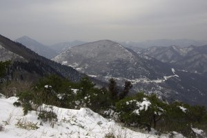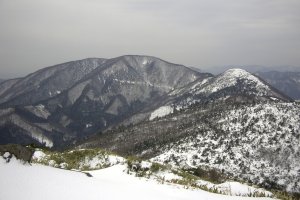 翌日は雨模様で丹後半島巡りをする。掟高原牧場は一面銀世界で、雨も上がったので笠山へミニツアーを楽しむ。昨日のうっぷんを少し晴らすことができた。海岸線近くの依遅ヶ尾山、風車の並ぶスイス村方面など、積雪をまとった丹後半島の山も標高の割りに立派な山容だ。帰路は日本海沿いのルートを通り、由良ヶ岳などこの方面で近畿百名山,関西百名山にリストされている山を眺めていく。