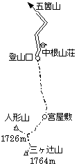 上平村(5:00)=中根山荘(6:10/6:34)…登山口(6:52)…宮尾敷(9:27)…人形山(10:34/11:08)