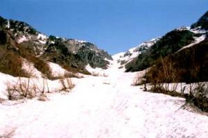頂上から大滑降開始。何とかスキーを履いたまま最上部のシュルントを渡ると、あとは正にスキーのためのフィールドだ。ターンの度に飛ばした雪が、谷にそって球状にゴロゴロ転がっていく。ときどき止まって雪崩の気配が無いか確認する。ゲレンデのようには飛ばせないが、36分でほぼ雪渓の末端まで来て本日の一人舞台終了。林道までの下りは、沢沿いの浮き石を避けて右の踏跡に入ってみた。しかし樹林の中の急傾斜で枝にスキーが引っかかり、かえって苦労されられた。