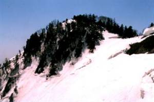 ようやく谷を詰めて稜線に出るところは、雪の裂け目が大きく口を開けていて、一番狭いところを飛び越える。最後の登りは、はじめ腐り雪の踏み抜きにやられたが、頂上手前は気持ちの良いまばらな針葉樹の中を行く。山頂は樹林の中の平凡なピーク。展望も、白山方面が隣の奥三方岳に隠されてしまいパッとしない。連休ど真ん中なのに、他の登山者には誰も会わずじまい。白山に近すぎることも、こんな不遇の山になってしまった理由か。周辺の山から見ると、すばらしい山容でありもったいない。