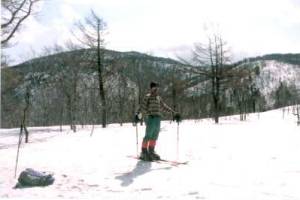 難所を終え一安心して、人形山との分岐で缶ビールを空けて大休止。下山中4人組が登ってきたが、時間が遅いので急登の手前で引き返すという。ここまで来て頂上までもう遠くないのに。宮屋敷からはスキーではないものの靴すべりを交えて、登山口までは1時間の下りであった。