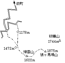 (9:00/9:20)…猿ヶ馬場山(10:40/11:23)…帰雲山(11:59/12:05)…沢へ下る1150m(13:00)