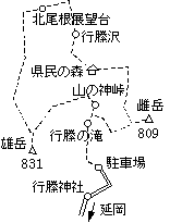 両峰の間、山ノ神峠の下に行縢ノ滝がある