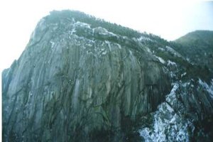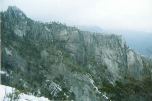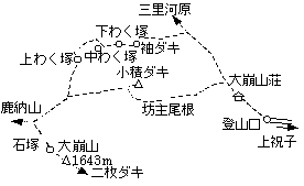 祝子川沿いに山奥へ入り、林道脇の案内図に導かれて登山開始。朝方は晴れて目指す岩峰の山を望むことができたが、次第に雲が広がってしまう。登りはわく塚コースを選ぶ。上方に岩峰群が聳えているのを見ながら、補助ロープを頼りに丸木橋を渡る。急登をあえぎ、分岐を左に直登すると岩場の上、袖ダキに出る。眼前には小積ダキの大岩壁。登山道は右を巻いているが、左側が絶壁となった淵沿いに下わく塚から中わく塚へたどるルート(パノラマコース)を行く。スリルと展望が楽しめるが、所々凍結しているのでスリップには要注意。先行者のトレースがあったので助かった。中わく塚付近の岩峰群では積雪の為少々迷う(先行者も迷った様子)。ガイドでは中わく塚の最高点まで登れるとされているが、残置ロープが切れていてザイルでも無い限り無理。少し手前から、下を巻いている登山道へ降りる道が分岐する。