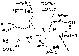 …小篦柄岳(11:32/11:40)…スマン峠(12:06/12:14)…御岳(13:02/13:15)…妻岳(13:52/14:14)
