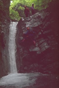 わざとすべりやすい樋状の滝をかけ登る。上にはギャラリー、成功すると歓声が。