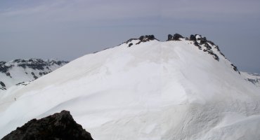 鉾立方面からか、ダイレクトに新山へスキーで登っているパーティが見える。新山の急斜面にシュプール跡が見られるが、短いのでここからわざわざスキーを担いでいって滑るほどでもない。ゆっくりしてからスキーはデポして、外輪山のガレ場の夏道を下り、新山を往復した。頂上の岩峰によじ登って遊んでから七高山へ戻り、いよいよ大滑降だ。ルートをはずさないように夏道に近いコースを、初心者を尻目にどんどん滑って、わずか23分で駐車場へ。長い時間かけて登ったので、下りも景色を楽しんでゆっくりいう人には不向きだが、スピード下山も爽快である。