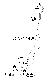 温海温泉(4:10)=祓川(7:19/7:50)…七高山(11:02/11:51)…新山(12:08/12:12)…七高山