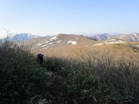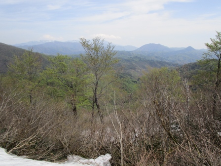 栗子山山頂から北への縦走は情報が無く未知の世界。藪のなかを少し進むと広い残雪の上に出て、福島側の雪の上を歩けるので、部分的にやせた部分の藪こぎがあるものの概ね快適。夏道に出て駒ヶ岳を往復、中ノ沢峠で夏道は下っていき、この先鳩峰峠までは残雪がほとんど無く厳しい藪こぎ。計画は最長、二井宿峠までを目指していたが、この藪では無理と見て、踏み跡がある龍ヶ岳を往復して鳩峰峠から冬季通行止の国道を歩いて山形側に下山した。