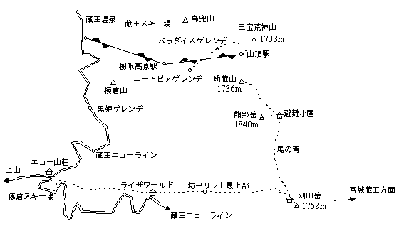 …熊野岳(12:43/12:45)…刈田岳(13:23/13:40)…坊平ライザスキー場(14:15/15:00)