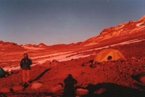 は体を動かした方が良いと、到着後せっせとテント場作りに励む。アコン頂上は西壁の