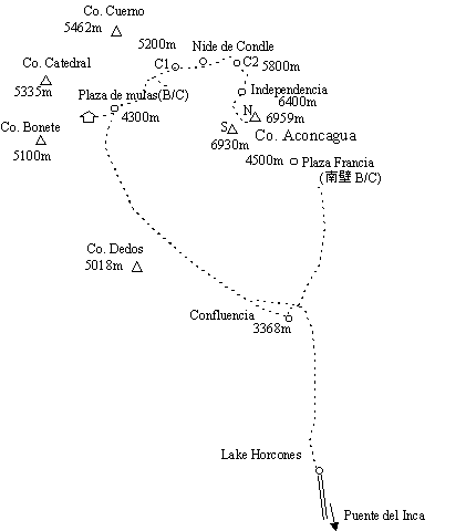 いまさら説明するまでも無いかもしれませんが、アルゼンチンのチリ国境近くにそびえる南北アメリカ大陸の最高峰。12〜2月の夏期シーズンには、ノーマルルートからは特別な登攀技術を必要とせずに頂上に立てるために、世界中から多くの登山者が訪れる。標高約7000mであり、高度障害・強風・寒さが登頂を阻む要因となっていて、登頂を目指す登山者の約半分しか頂上に立てないといわれる(岳人96年10月号等参照)。