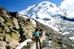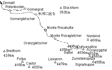 午後1時を過ぎ氷河の雪が緩み、アイゼンはダンゴになり下りも大変疲れる。モンテローザ氷河末端からも雪の上や岩のゴロゴロした道を進み小屋は遠い。今夜のツェルマットのホテルと明日の氷河特急を予約しており、登山電車の最終には乗らないといけない。最後のゴルナー氷河からローテンボーデンまで地獄の登りで私のペースはガタ落ち。夜8時の最終電車にぎりぎりというありさま。私は食欲も無くホテルに着くなりバタンキューであったが、Kさんは外のレストランへ夕食に行ったそうで、その体力には感心する。このコース、4000m峰登山ガイド日本語訳版でPDとされているが、ドイツ語の最新版ではPD+とグレード高くなっており、さもありなんという感じだ。ガイドレスでペースが遅かったこともあるが、行動時間17時間半はアコンカグアを抜いて私の最長記録となった。