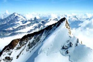マッターホルン,ブライトホルン...ヴァリスの山々に朝日が当りはじめ、少し気持ちの余裕が出てくる。先行3人パーティーを抜き、4359mのザッテルへ。イタリア側の登りやすいシグナルクッペの姿も目に入る。標高的にはかなり登ったが、この先稜線伝いに頂上までも大変だった。