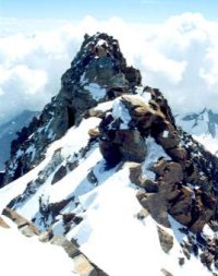 これまでより急な雪の斜面を登ると岩場に出る。痩せていて高度感があり、上下も多い。高度で息も苦しく距離がはかどらない。小屋の夕食で御一緒したガイド登山のオランダの2人組が登頂して下りてきて挨拶、なかなか早い。時々ルートに迷い、また下山者とのすれ違いも気を使う。相手がガイドだとこっちが止まっているだけでうまく避けてくれる。手前のピークを通過すると最高点へ雪のトレースの急斜面となる。岩場に比べるとずっと楽だ。だが頂上へはさらに厳しい岩稜が続いていた。写真タイムをとる余裕もなく、ザッテルから2時間近くかけて頂上直下、ここで8m程の岩壁に阻まれた。