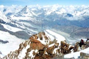ちょっと雲が出てきたが、マッタホルンや周辺のモンテローザ山群をぐるり見渡す。目の前にグレンツギプフェルがほぼ同じ高さで聳える。そちらへの縦走は大岩に阻まれさらに難路(3級)。先はスキー向きのノルトエントから、鋭い山容のリムプフィッシュホルン(アラリンホルンの近く)そしてドムへと遥かに続く稜線。眼下には蛇行した氷河もずっと下に見える。