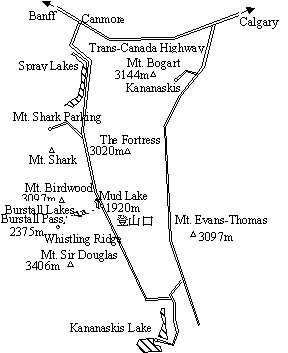 Tuunel Mountain Campground[7:30]=Canmore=Burstall Pass登山口[9:03/9:16] …Burstall Pass[11:25/12:04]…登山口[13:51/14:14] =Kananaskis Lake[14:43/15:14]=カルガリー(Ramada Hotel)[17:40] |