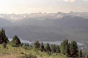 Maligne Lakeとその反対側の山並みが美しい。正面のOpal Peakは赤茶けた砂山で浅間山のような感じ。