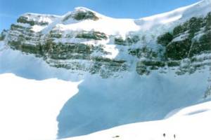 下山してくるスキーヤーも多い。パットと立ち話を始めた初老の男性は、バリーブランチャゴというロッキーの名クライマーらしいが、私には名前は初耳だった。一度右側のかなり上方で雪崩発生を見る。昨日の新雪と好天で要注意。この先幅の狭い谷間を通過するため、雪崩を警戒してパットから前の人と50mほど間隔を空けるよう指示される。