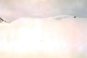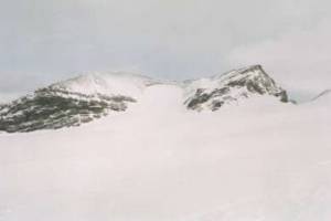 そうこうしているうちにガスが晴れて、また頂上を目指すことになった。この辺の行動はさすがベテランを感じさせる。雪原にポツンと有る岩の右から小尾根に登ると、これまで見えなかった頂上の裏側はちょっとした崖になっていて、その縁に沿って雪上を登っていく。無事頂上に到達し、先着カナダ隊とともに祝福しあった。雲が多いのとスケールも大きいので、山ははっきりしなかったが、明日以降たどるバルフォア・パス方面、ヨーホー谷やヘクターレイクなどに眺めいった。登頂できるとやはり気分が良い。Uさんは海外初登頂の山となった。
