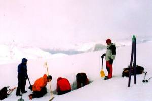 2900m位まで登ったところでガスが出て視界が効かなくなった。パットは、今日はこの辺までかと言う。我々は頂上まで行けないのが残念に思いながら、まだ時間もあるので大休止。パットはスコップを取り出し、弱層テストの穴掘りを始めた。Oさんを始め我々も少し手伝う。後からボウハットに居た若い男女3人(後でカナダBC州から来たとわかる)が来て手伝ってくれた。パットはSnow profileノートに雪質の異なる層構成を克明に記録している。1時間以上かけて2m以上掘り進んだが、さらに下に万年雪の層が続いている。
