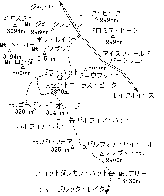 トラバースというのは登山用語の斜めに登る意味ではなく、横断旅行の意味で使われています。同行の富山のTさんが開設されているホームページ「富山の山登り」に今回のレポートが載りました(http://www.nsknet.or.jp/eat2/)。現地のガイドを担当したヤムナスカ登山学校にホームページがあります(http://www.yamnuska.com)。地図はTouring the Wapta Icefields(1/50000)が発行されています。岳人別冊雪世界1999にも記事があります。